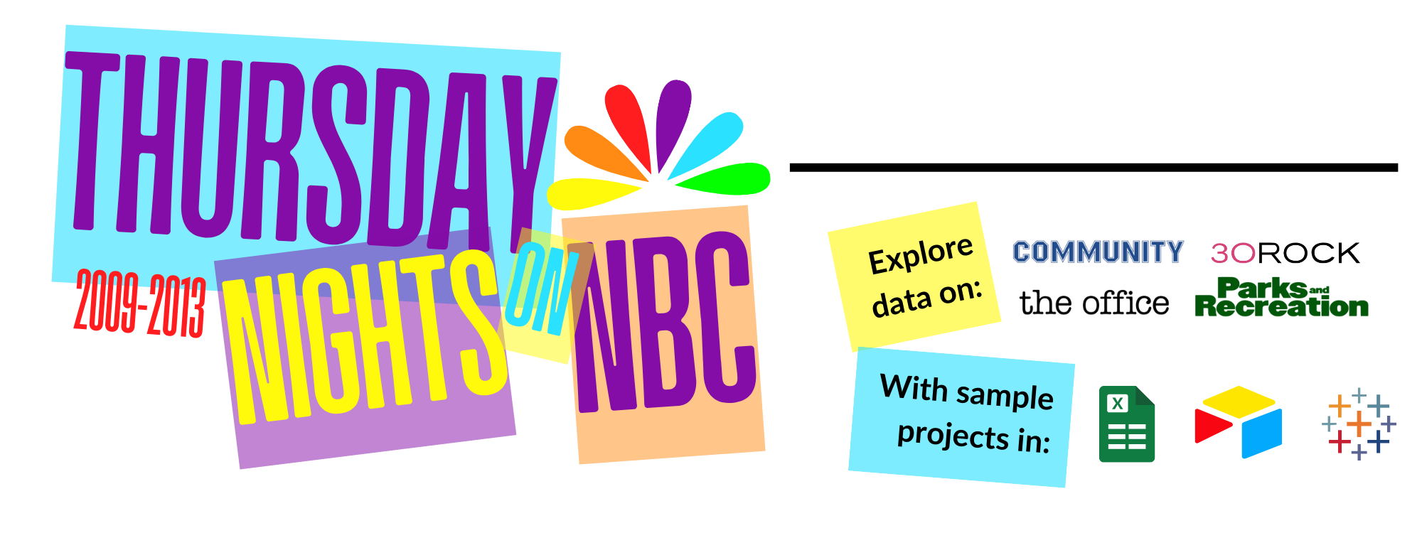 Using NBC’s 2009-2013 Thursday lineup, I collected a dataset with information on viewers, rankings, writers/directors, and other metrics. Explore what a project might look like in Excel, Airtable, or Tableau by clicking on the icons below.